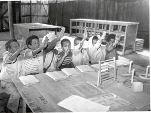 A careful and close study of the photograph by the UNESCO photographer, shown above, (click on the photo to enlarge) will show that the children are seated on wooden fruit boxes and that the table is assembled from rough wooden planks knocked down from shipping containers. Shortly after, this problem was solved through a small but very valuable grant from UNICEF that enabled the ENAD to buy children's chairs and tables. Playing and some didactic materials were provided by the Federation of the deaf and Hard of Hearing of the German Democratic Republic (former East Germany).